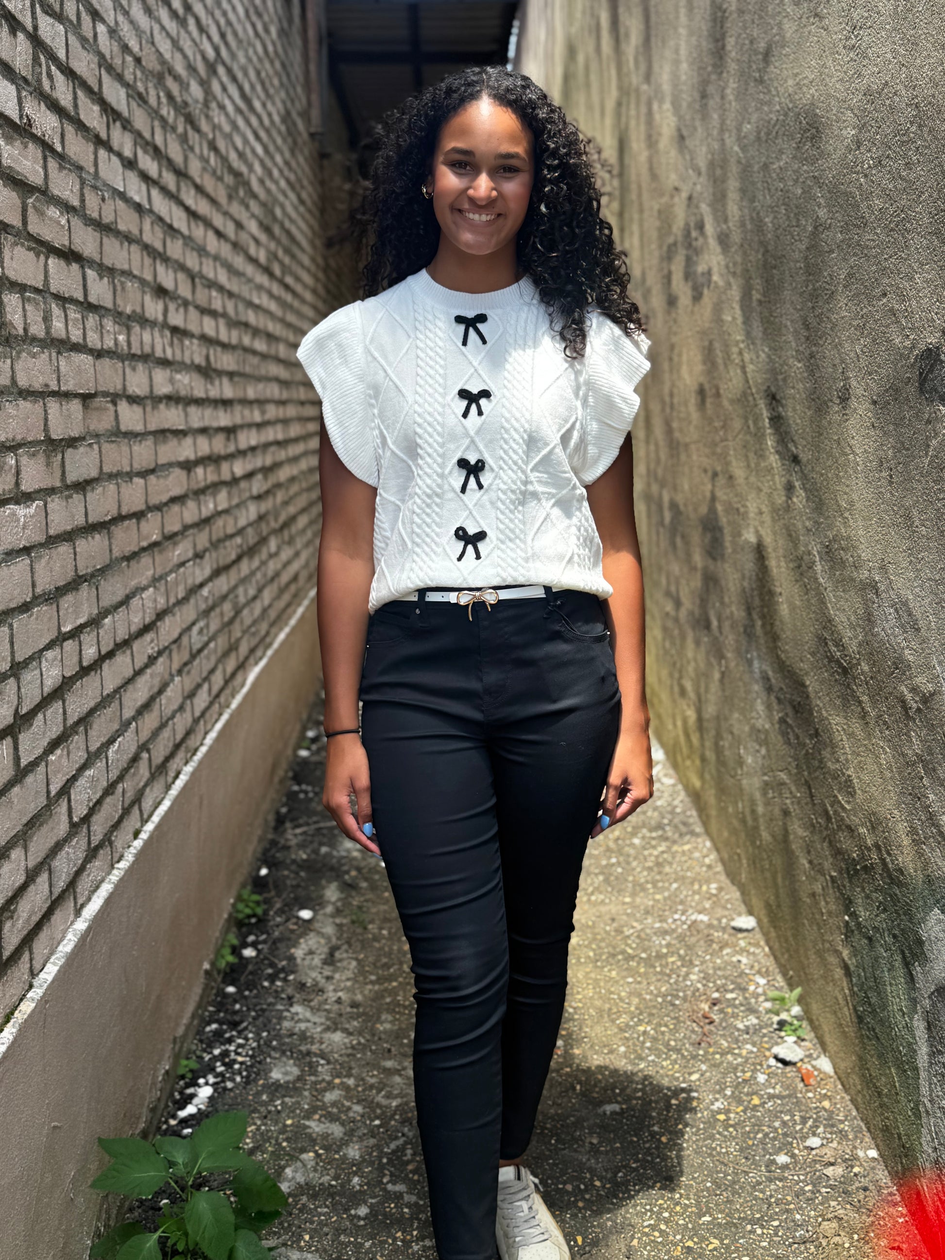 Ruffle Sleeve Sweater Knit Top Ruffle Sleeve Sweater Knit Top With Stripe And Center Crochet Flower Detail 100% acrylic |