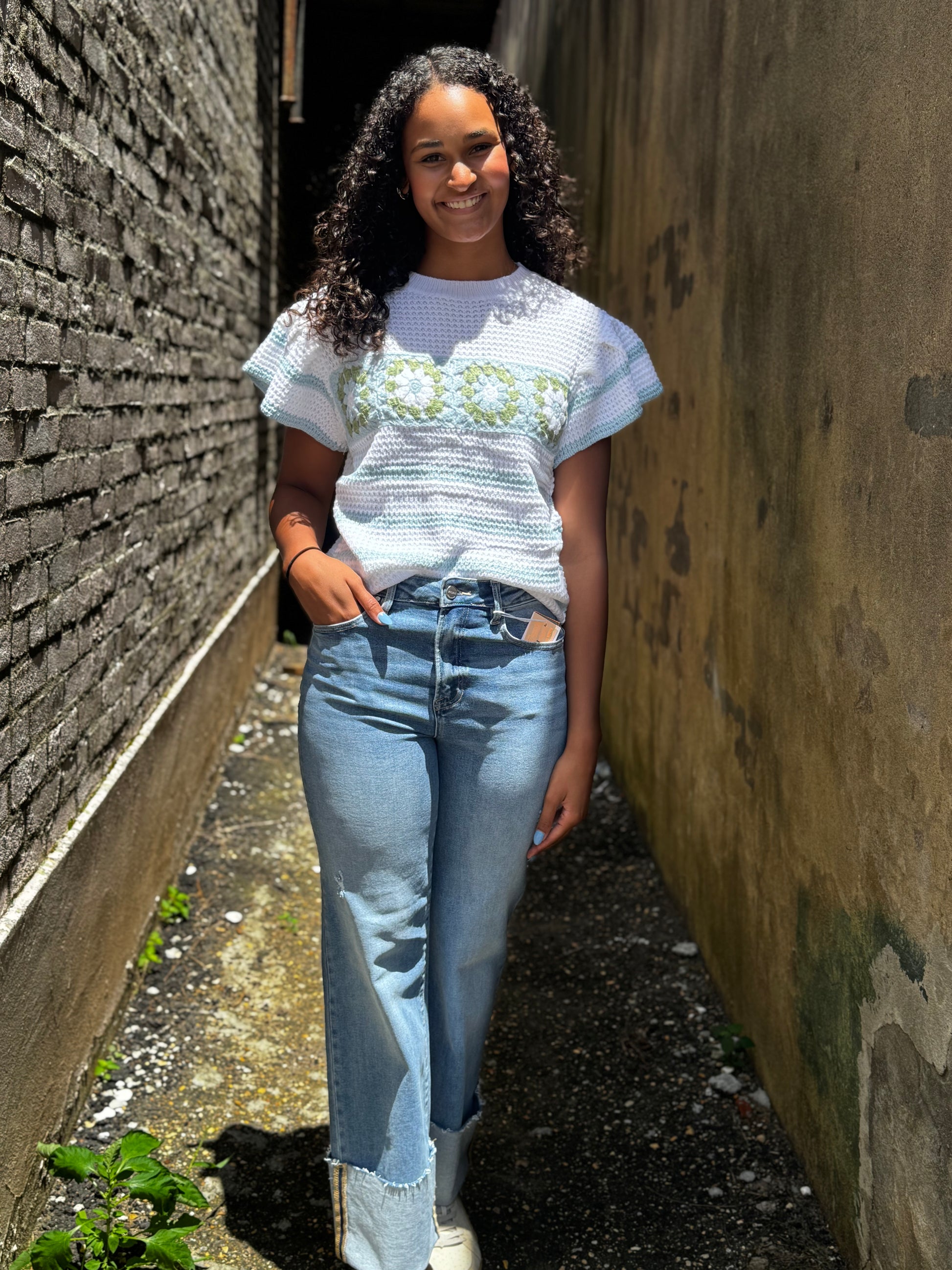 Ruffle Sleeve Sweater Knit Top Ribbon Bow Detail Round Neck Ruffle Sleeve Sweater Knit Top With Cable Knit Design And Center Ribbon Bow Detail 100% acrylic |